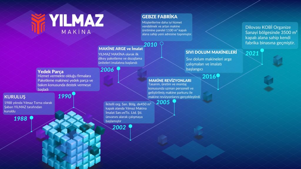 YILMAZ MAKİNA hizmet verdiği firma portföyüne, sektöründe lider olan ulusal ve uluslararası firmaları katmaya devam ederek (bkz.referanslarımız) , hem hizmet yelpazesini genişletmiş hem de tedarikçisi olduğu firmalarda kilit rol oynayan bir çözüm ortağı pozisyona ulaşmıştır. Firma sürekli olarak artan kapasite ihtiyaçlarını giderebilmek için 2022 yılı başında KOBİ Organize Sanayi bölgesinde 3500 m² kapalı alana sahip kendi fabrika binasına geçmiştir. Geçen yılların vermiş olduğu tecrübe ve kalite anlayışı ile müşterilerinin ihtiyaçlarını tam olarak anlayıp gerekli çözümleri çok kısa sürede, optimum maliyetlerle, yüksek kalitede ve işlevsellikten ödün vermeden sunmayı amaç edinen YILMAZ MAKİNA paketleme proseslerinde edindiği yüksek tecrübe ile 2007 yılında başlamış olduğu dikey paketleme makinalari ve hassas dozajlama üniteleri arge çalışmalarını, 2008 yılında müşterilerinin beğenisine YILPAK markası ile ürün olarak sunmuş ve paketleme proses ekipmanları pazarında yerini almıştır.