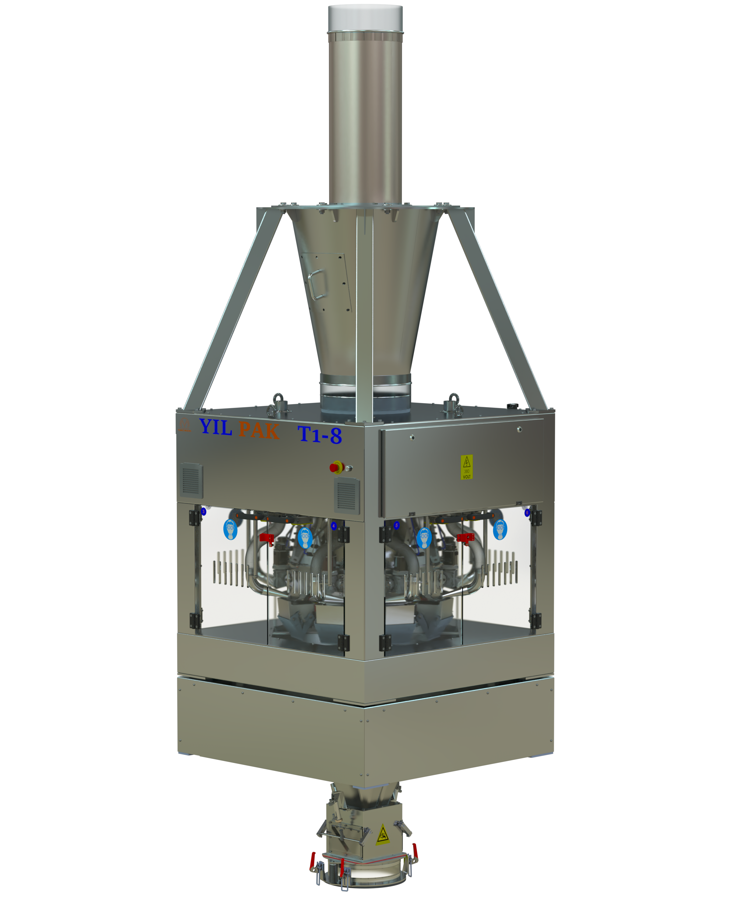 YILPAK T1-8 ürün dozajlama makinası, iş güvenliği kurallarına uygunluk, maximum hız, uzun kullanım ömrü, düşük bakım maliyeti ve yüksek hedef dozajlama hassasiyeti için tasarlanmıştır. Seçilen dozajlama kefesi ölçüsü ve ürün dansitesi kriterlerine bağlı olarak 50 – 1000 gr. aralığında yüksek hassasiyetle ürün dozajlama işlemini gerçekleştirir.